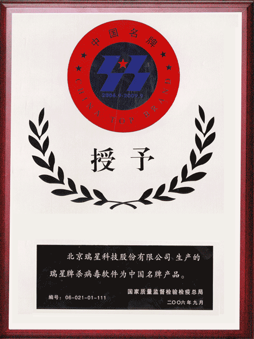 9月6日,中國名牌產品表彰大會在人民大會堂舉行,國家質檢總局、中宣部、國家發改委、共青團中央、全國總工會及國務院有關部門的領導出席了表彰大會,并向獲獎企業代表頒發獎牌和證書。在本次大會上,高新技術產業成為令人矚目的焦點,首批“中國名牌”軟件誕生,其中瑞星殺毒軟件榮獲大會頒發的“01-111”號中國名牌產品證書。