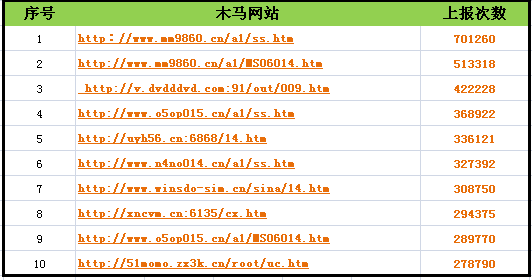 排行首位的木馬網(wǎng)站被攔截的次數(shù)70萬次;第二名的木馬網(wǎng)站被攔截次數(shù)為51萬余次;第十名的攔截次數(shù)也達到27萬余次。