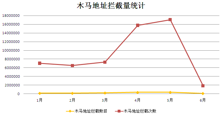 “木馬地址”是指可以直接下載木馬病毒的URL網(wǎng)址,從瑞星“云安全”數(shù)據(jù)中心上半年統(tǒng)計看,被攔截的木馬地址數(shù)目為1196092個,去掉重復地址后的數(shù)目是26832個,攔截次數(shù)共56143839次。其中6月份被攔截木馬地址數(shù)量為3601935次掛馬減少威脅未減,比5月份有明顯下降,掛馬減少威脅未減網(wǎng)絡(luò)安全狀況趨于平穩(wěn)狀態(tài)。