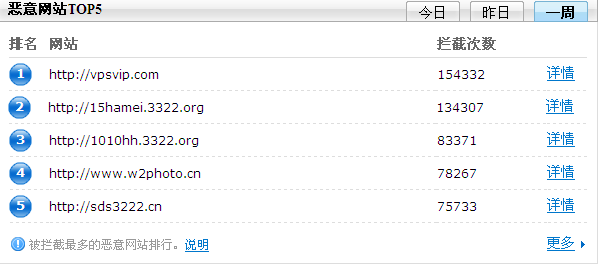 截至6月29日,惡意網(wǎng)站http://vpsvip.com和http://15hamei.3322.org在排行榜上位居前兩位,一周內(nèi)分別攻擊了154332人次和134307人次,都在了十萬次以上。瑞星安全專家表示,黑客往往會把同一個惡意網(wǎng)站的木馬網(wǎng)址,同時植入多個被攻陷的正常網(wǎng)站,例如http://vpsvip.com就被嵌入了多個流行網(wǎng)站、外掛網(wǎng)站,所以才能有如此大量的受害用戶。