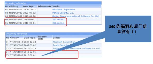 更為“神通廣大”的奇虎 360 公司甚至操作了此前公布其軟件后門的波蘭安全組織 NTInternals ?。ǖ刂罚?http://www.ntinternals.org/advisory.php )這個對于中國安全行業(yè)和廣大中國用戶神秘而又陌生的“境外安全組織”,此前曾公布了 360 安全衛(wèi)士的后門,但在奇虎公司給媒體發(fā)送恐嚇郵件后,我們驚奇的發(fā)現(xiàn),在NTInternals公布軟件漏洞的頁面上, 360 安全衛(wèi)士的后門信息居然消失了。細心的安全愛好者已經(jīng)發(fā)現(xiàn)了這個靈異事件,如果是一般安全軟件被曝出后門,軟件修復后,會在頁面中加入“已經(jīng)修復”的標示,但現(xiàn)在就連“ 360 ”這樣的文字也瞬間蒸發(fā)!