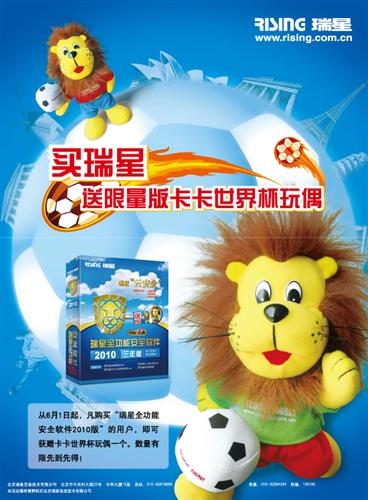 自即日起至7月,用戶每購買一套“瑞星全功能安全軟件2010(三年版)”,即可獲贈“瑞星卡卡世界杯玩偶”一只。據了解,100萬只活潑可愛的“瑞星卡卡世界杯玩偶”已經陸續運往全國各大軟件賣場,這也是國內殺毒行業首次開展以“世界杯”為主題的營銷活動。