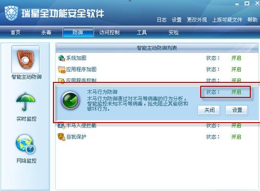 第二、“超級工廠病毒”具有多個變種,為防止新變種入侵電腦,用戶可點擊瑞星殺毒軟件主頁面——“防御”——“木馬行為防御”,將其狀態(tài)更改為“開啟”。級別保持系統(tǒng)默認,或者提到“高級用戶”均可。示意圖如下: