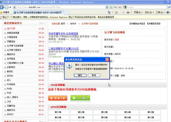 有些不良的在線觀看網(wǎng)站借助安裝本站專(zhuān)用網(wǎng)站的機(jī)會(huì)誘使用戶(hù)安裝病毒,甚至以“本站播放的是盜版電影,會(huì)遭到瑞星等軟件攔截”等為由誘使用戶(hù)關(guān)閉殺毒軟件。年初發(fā)現(xiàn)的虎虎生威系列病毒變種就是以QVOD播放器下載為誘餌傳播的。