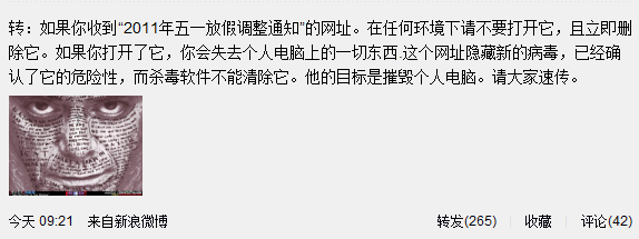 “公安廳發(fā)來的信息:如果你收到‘2011年五一放假調整通知’的網(wǎng)址。在任何環(huán)境下請不要打開它,且立即刪除它。如果你打開了它,你會失去個人電腦上的一切東西。”這就是通過微博、QQ進行轉發(fā)的謠言內容。更有甚者,竟然冒用“濟南市公安局濟南網(wǎng)監(jiān)辦的武警官”的身份發(fā)布謠言,造成大量網(wǎng)民上網(wǎng)搜索該信息的真?zhèn)危壳霸诎俣壬纤阉鳌?011年五一放假調整通知”關鍵字,已有近百萬的搜索結果,由此可見該謠言對網(wǎng)民造成的恐慌。
