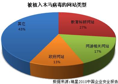 2010年,國內(nèi)有250120個網(wǎng)站被植入了病毒或者木馬(以域名計算)。教育科研網(wǎng)站、網(wǎng)游相關網(wǎng)站和政府網(wǎng)站,是最容易被攻擊植入木馬的三個領域,分別占總體數(shù)量的27%、17%和13%。