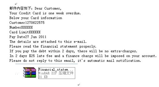 2011-07-14 11:00:06近日,某網友向記者爆料,他收到了一封發信人看上去很像“銀行”的英文郵件和附件。被告知他的信用卡已逾期一個星期,2天內將被征收滯納金和財務費用25美元。記者把該信件轉給瑞星公司,經過專家分析后得知,該郵件帶有的附件是個病毒。針對該病毒,瑞星公司已經緊急處理,截獲并查殺此類病毒郵件。