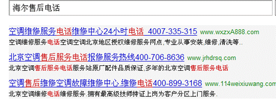 (在搜索引擎搜“海爾售后電話”,結果卻是真假難辨的400電話)