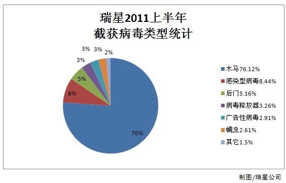 2011年上半年,瑞星“云安全”系統共截獲新增病毒樣本5,286,791個,病毒總體數量與去年同期相比上升25.2%。其中木馬病毒4,024,499個,占據總體病毒比例的76.12%,緊隨其后的病毒依次為感染型病毒(win32)、后門、病毒釋放器(Dropper)和廣告程序。