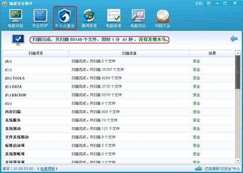 作為一款永久免費的安全輔助工具,瑞星安全助手的“云查殺”系統將龐大的病毒特征庫放置在云端,自動進行后臺診斷和在線診斷。當用戶進行掃描時,殺毒軟件與云端進行實時驗證,可以幫每位用戶設計出個性、精準的本地病毒庫信息,確??焖俸透邭⒙实那疤嵯卤M少占用用戶資源。