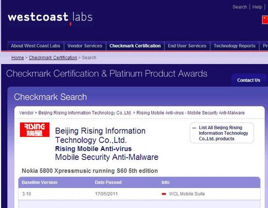 早在今年5月,瑞星手機安全軟件還在公測期內,就通過了國際權威的英國西海岸實驗室檢測。著實為國內第一款通過該認證的手機安全軟件,這充分證明了瑞星手機安全軟件的技術實力。