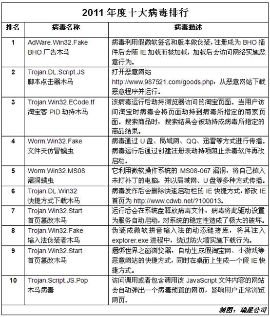 2011年共11.7億人次網民被病毒感染,按感染人數、變種數量和代表性進行綜合評估,瑞星評選出了2011年的十大病毒。