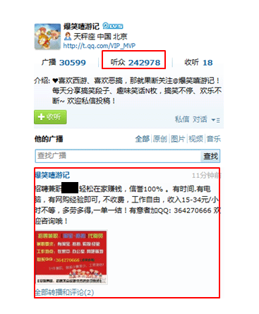 2012-08-23 09:54:13近期,許多網(wǎng)友在騰訊微博上都收聽到了這樣一條廣播:“某網(wǎng)購網(wǎng)站招聘兼職,輕松在家賺錢,信譽100%。不收費,工作自由,收入15-34元/小時不等。”這條廣告看似不起眼,但是當(dāng)中的“不收費”、“工作自由”、“收入15-34元/小時”等字眼都讓許多尋求兼職的網(wǎng)友怦然心動。然而令人意想不到的是,一個擁有24萬粉絲的博主發(fā)布的內(nèi)容,竟然是一個釣魚詐騙信息。