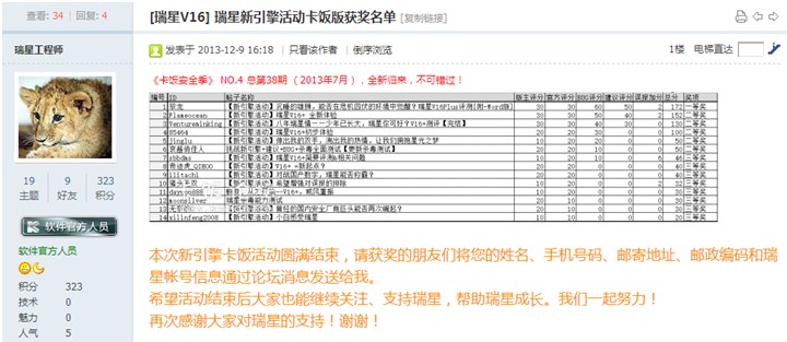 本次測試大賽共評出一等獎2名、二等獎10名、三等獎18名及四等獎若干,分別獎勵iPad mini、鍵盤鼠標套裝、音箱和瑞星卡卡大禮包等獎品。據統計,本次參加測試大賽的共有近百名網友,都是較為專業的信息安全發燒友,兩個論壇共發貼五百余個,共有數萬專業人士參與討論。通過這次活動,瑞星不但向更多業內人士展示了V16+在技術方面的巨大成功,同時也收獲了許多來自專家的寶貴意見和建議。