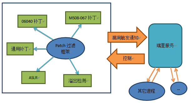 瑞星XP保護傘熱補丁技術通過修改存在漏洞的指令代碼流程來檢測漏洞,當檢測到漏洞攻擊時,通過IPC通知服務。通過規避常用的漏洞攻擊點實現預防功能,如打開DEP,ASLR,預分配椎噴射常用的地址來實現免疫功能。