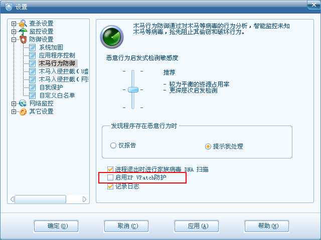 在彈出的設置程序界面中,切換到“木馬行為防御”設置頁面,可以看到“啟用 XP VPatch防護”功能設置項,如圖