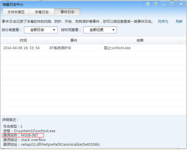 下述為瑞星殺毒軟件XP保護傘阻擋MS08-067病毒對沒有安裝微軟補丁的XP系統的保護。