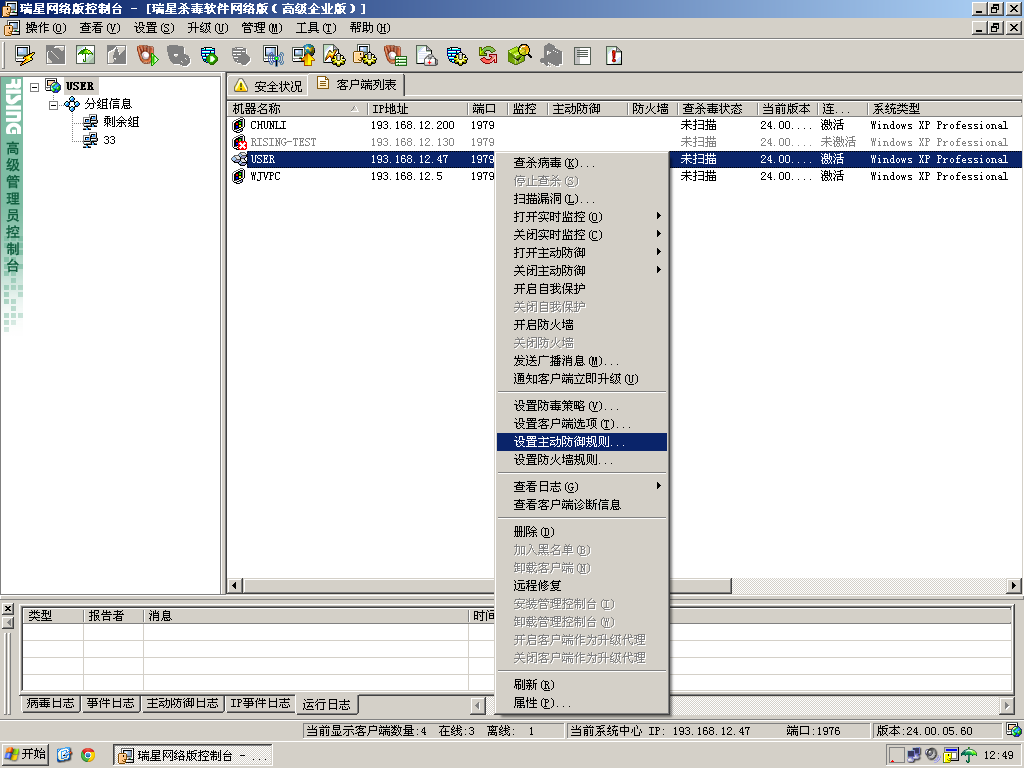 在網絡版系統中心,打開“管理控制臺”程序,右鍵選擇需要開啟XP VPatch 功能的組或客戶端,在彈出菜單中,點擊“設置主動防御規則”,如圖