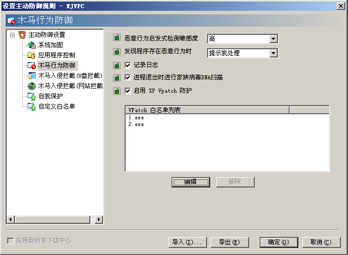 在“設置主動防御規則”界面,切換到“木馬行為防御”設置界面,可以看到“啟用 XP VPatch防護”功能設置項,如圖